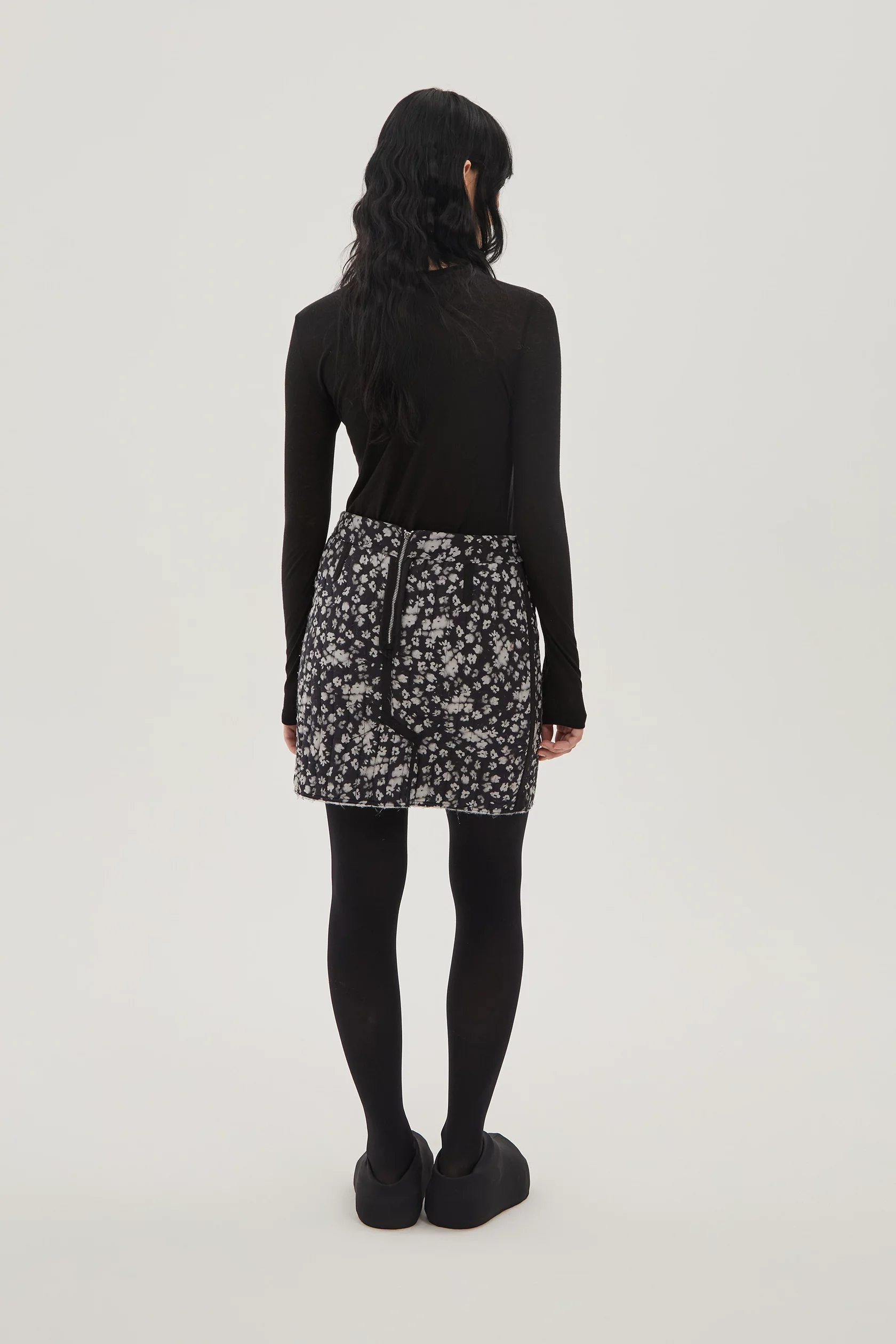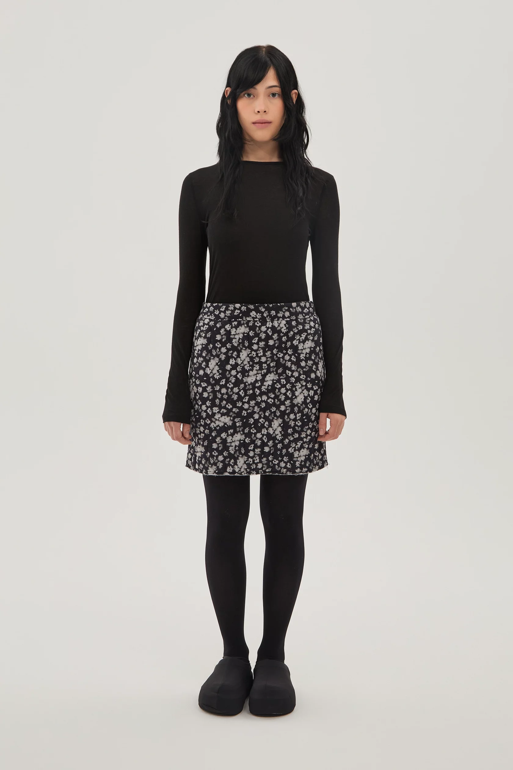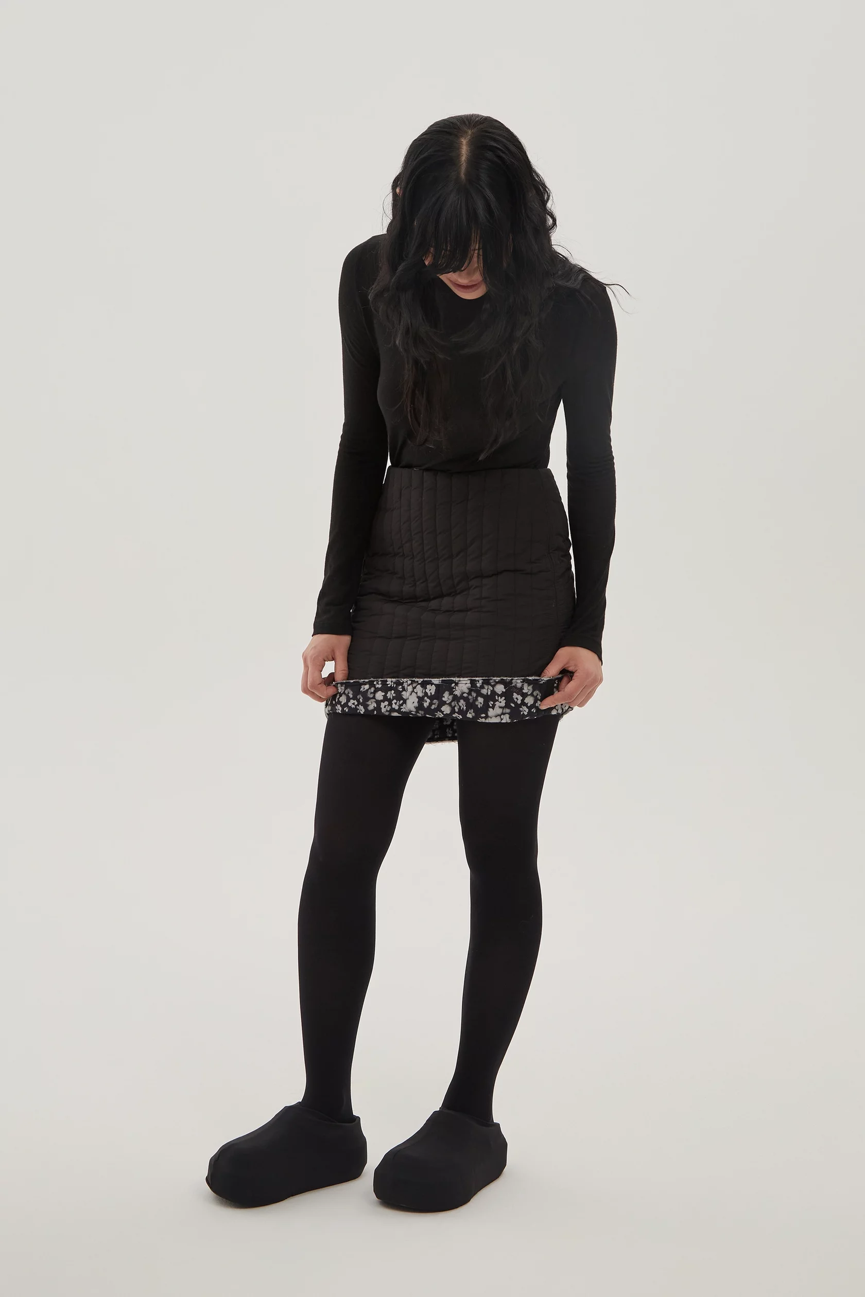 Стеганая мини юбка на тонком легком утеплителе. Верхняя ткань - ветро- и влагозащитная, внутренняя ткань - хлопок с почерковым принтом в виде размытых цветов. Эту вещь можно носить как черной стороной наверх, так и цветочной.