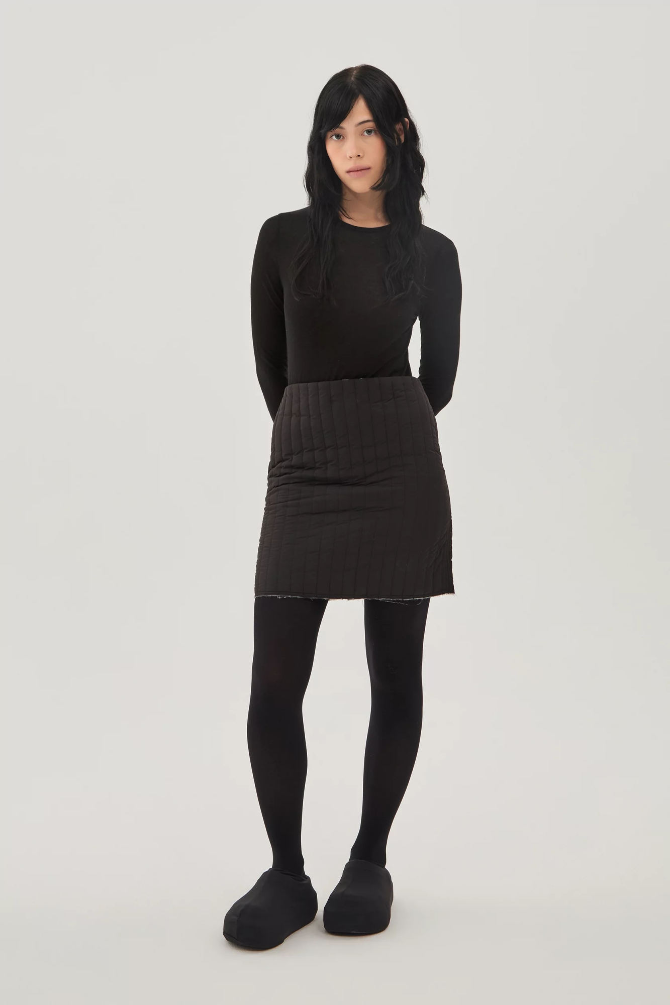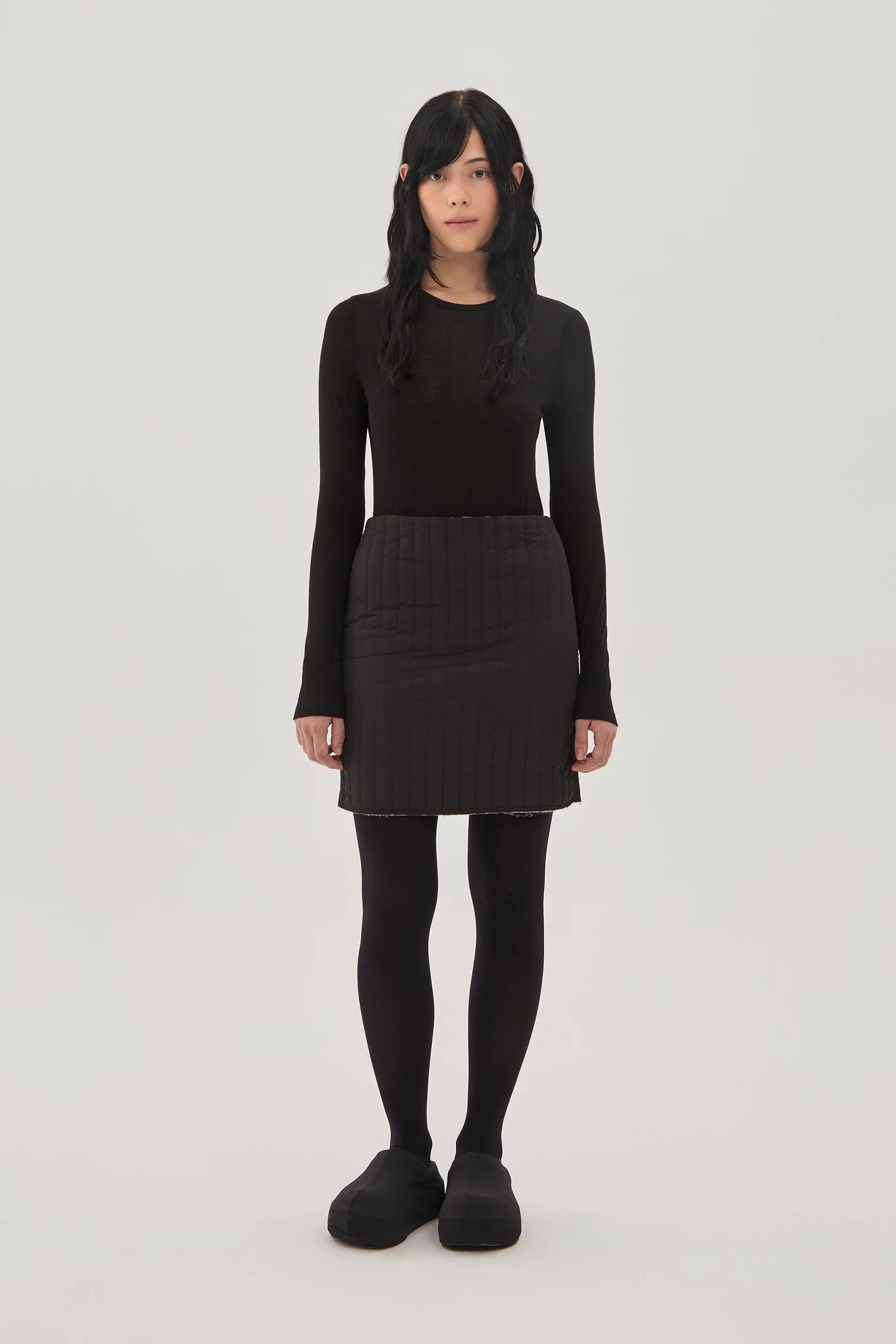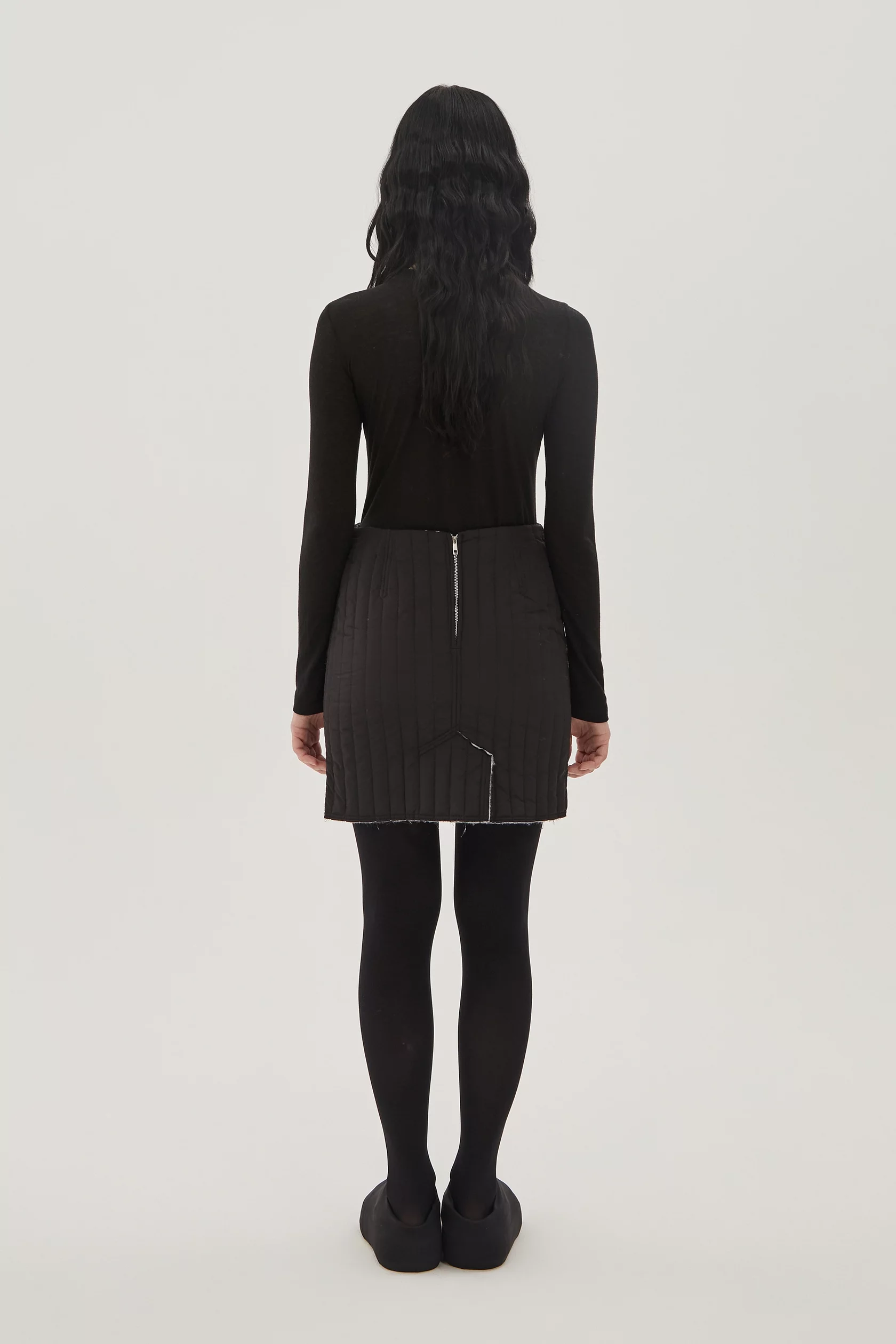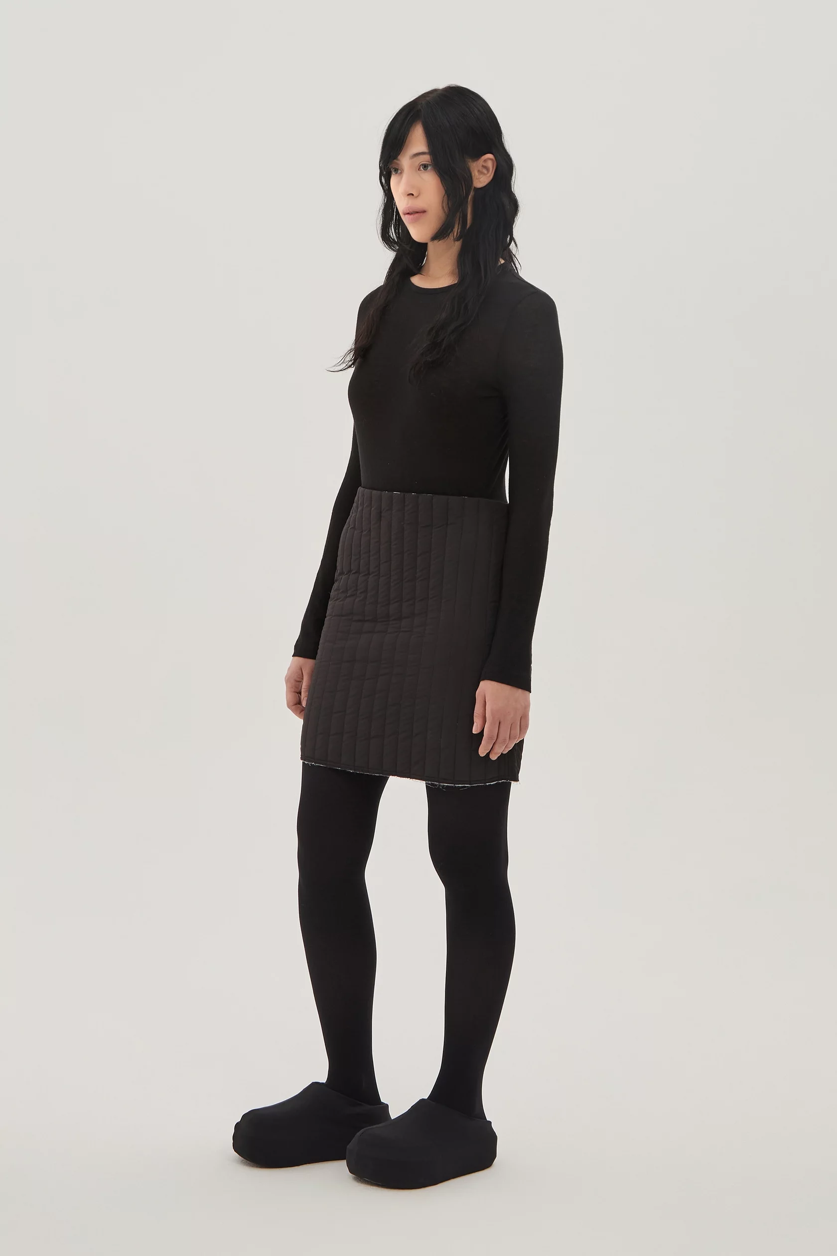 Стеганая мини юбка на тонком легком утеплителе. Верхняя ткань - ветро- и влагозащитная, внутренняя ткань - хлопок с почерковым принтом в виде размытых цветов. Эту вещь можно носить как черной стороной наверх, так и цветочной.