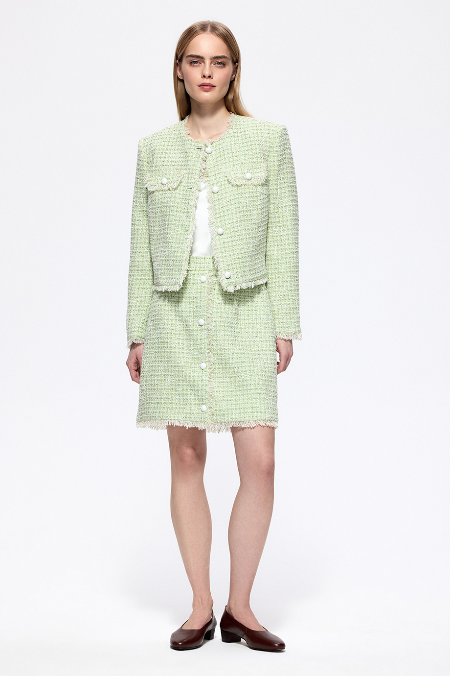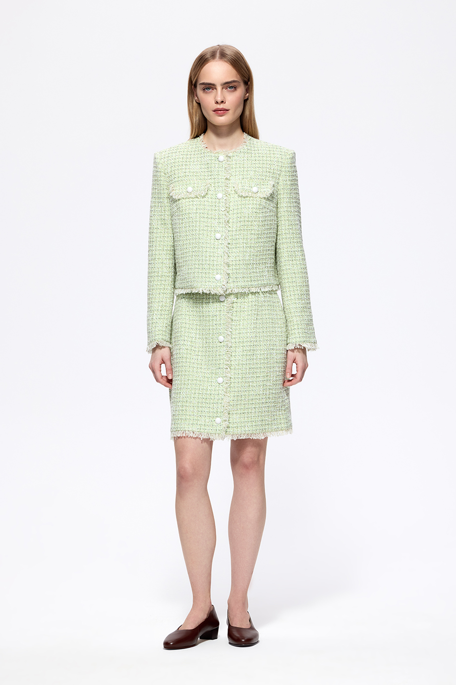 Элегантная юбка из твида — идеальный элемент для создания стильного образа. Она прекрасно сочетается с жакетом из этого же комплекта, добавляя вашему наряду утончённость и изысканность.