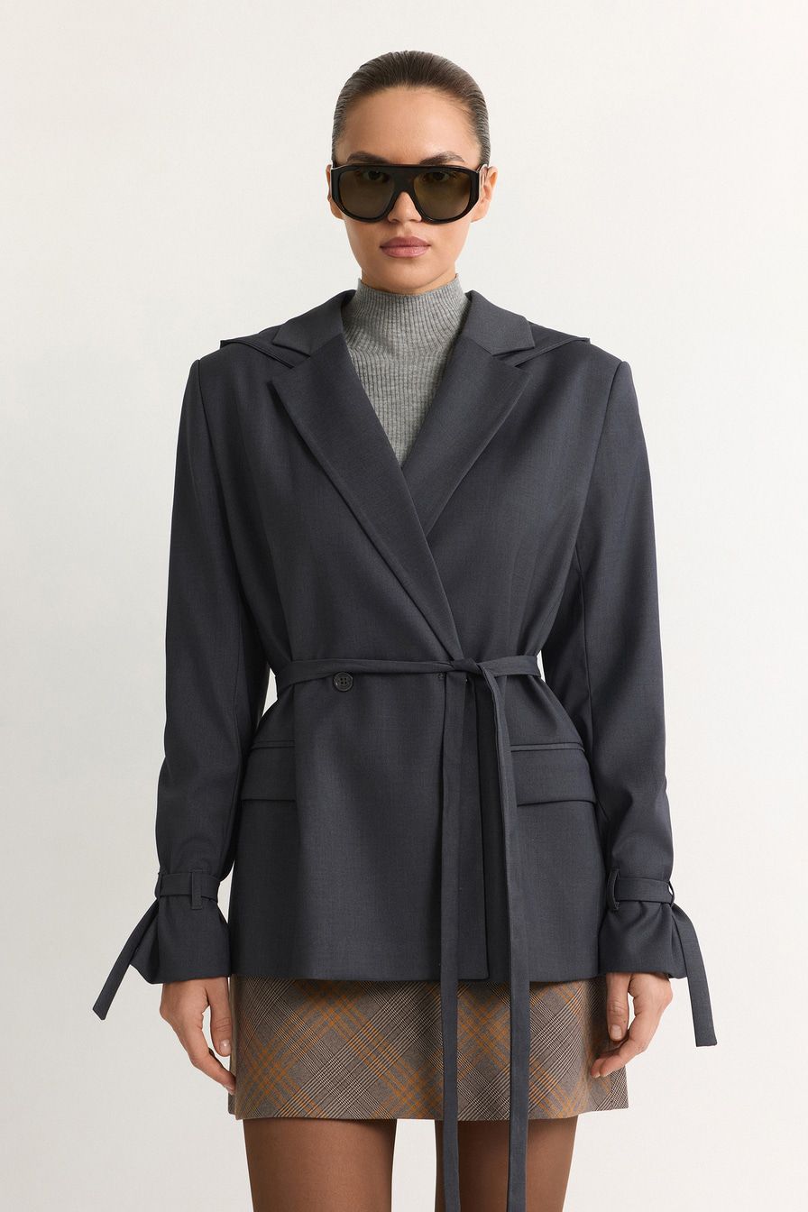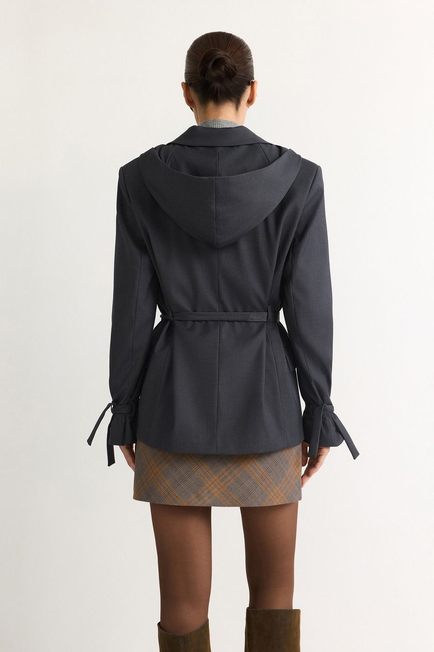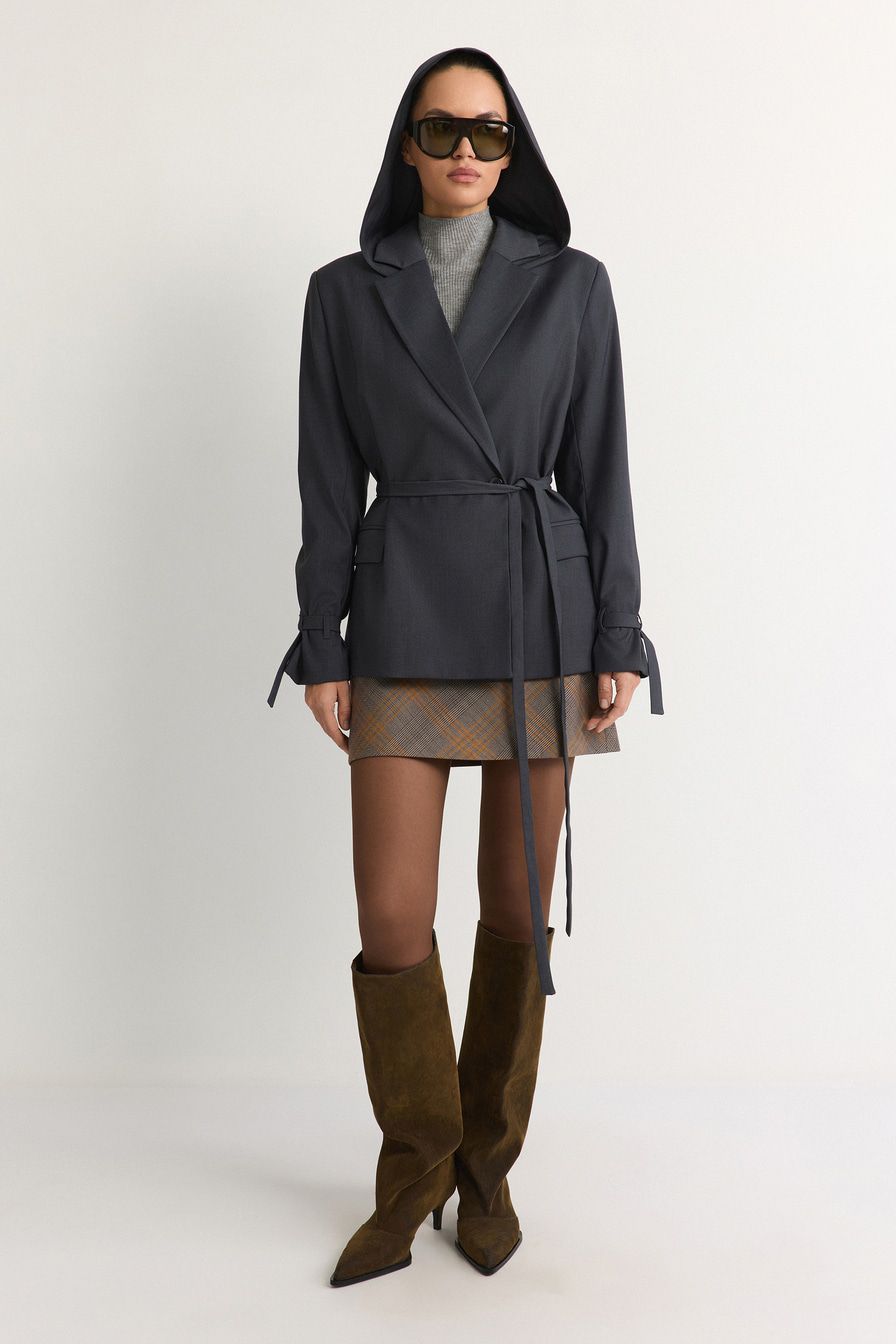 Двубортный жакет свободного кроя выполнен из смесовой вискозы, дополнен капюшоном и длинным поясом.