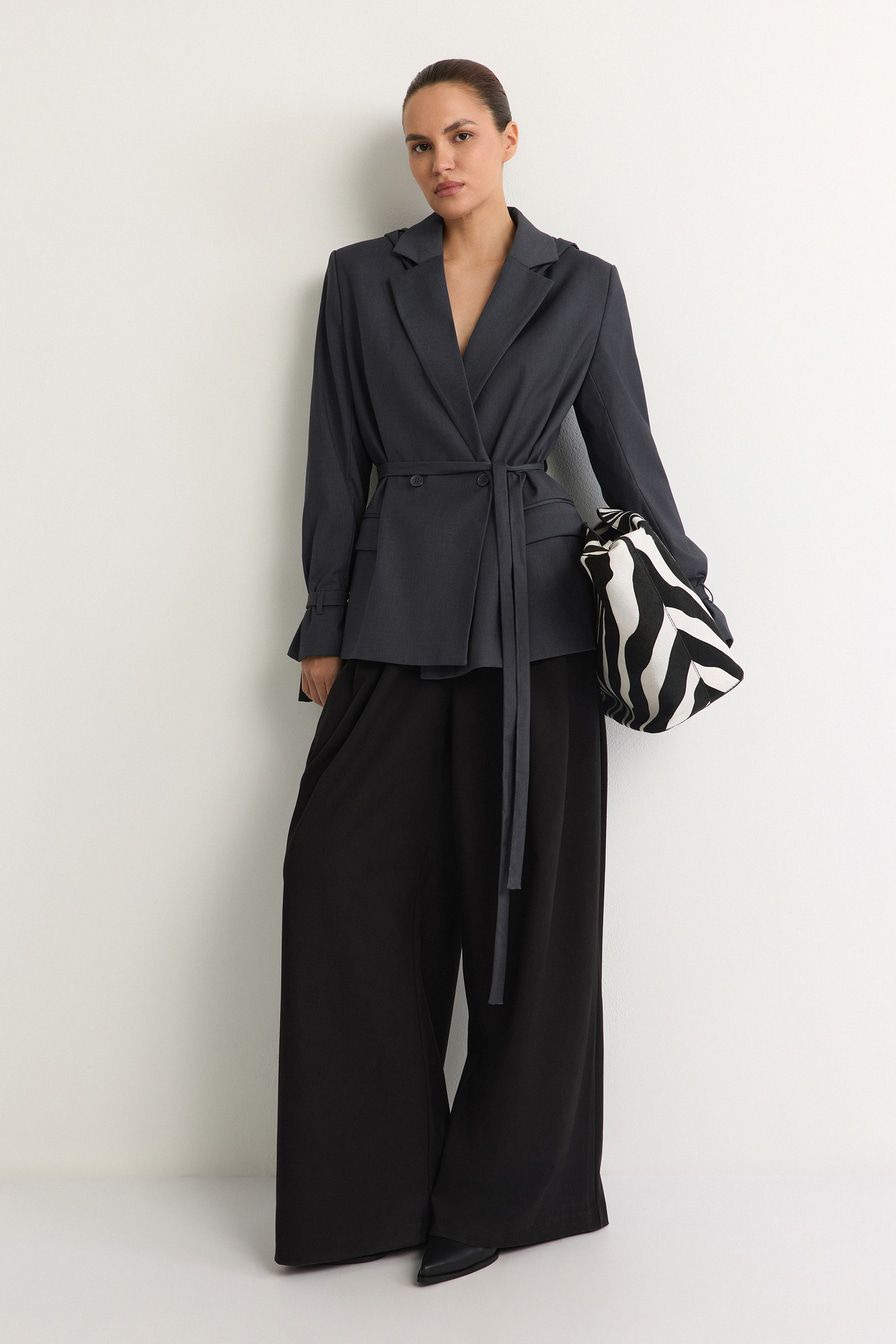 «Для встречи с подругами сочетайте жакет с широкими брюками, ботильонами с острым мысом и небольшой сумкой-шопером».