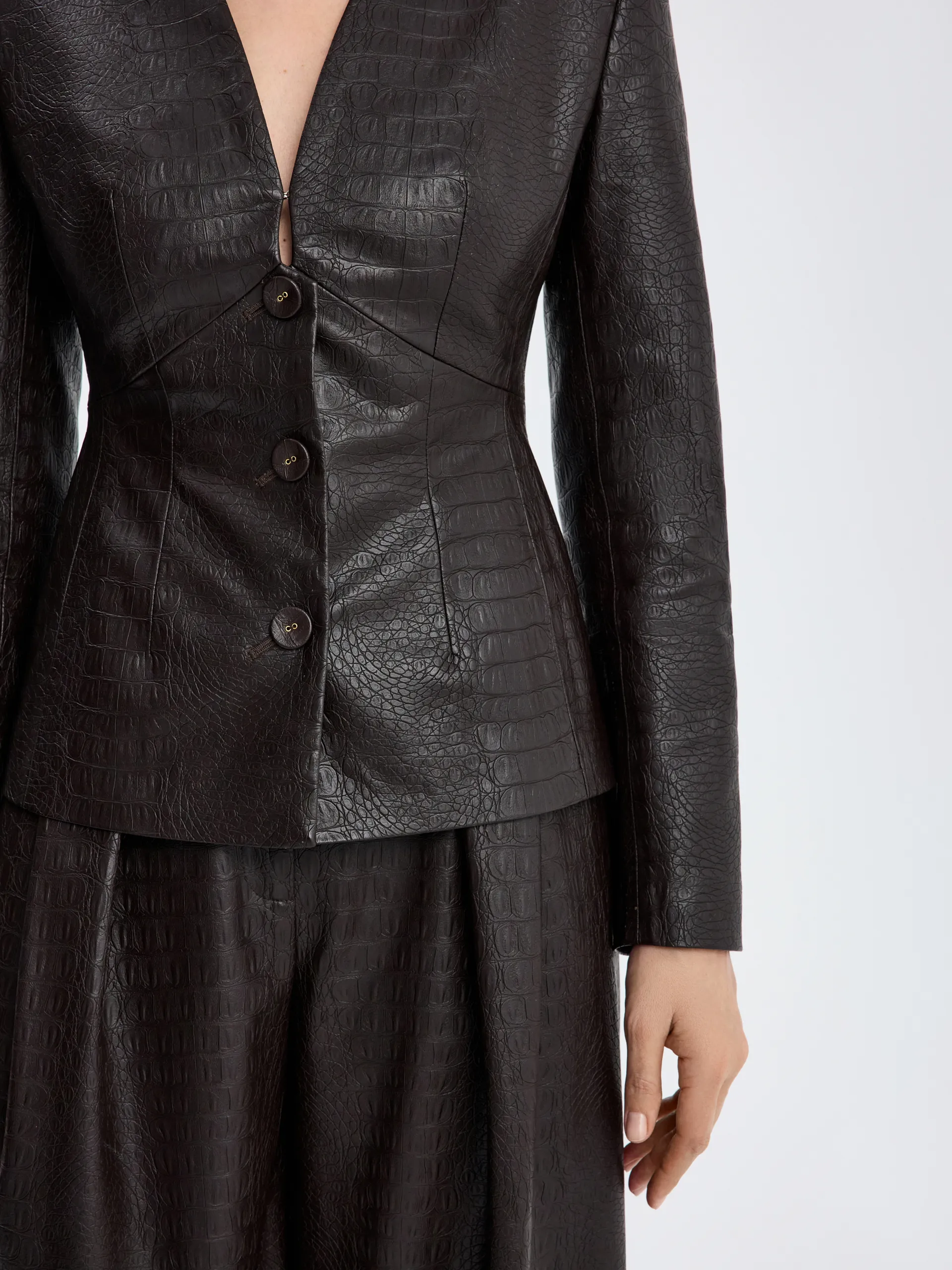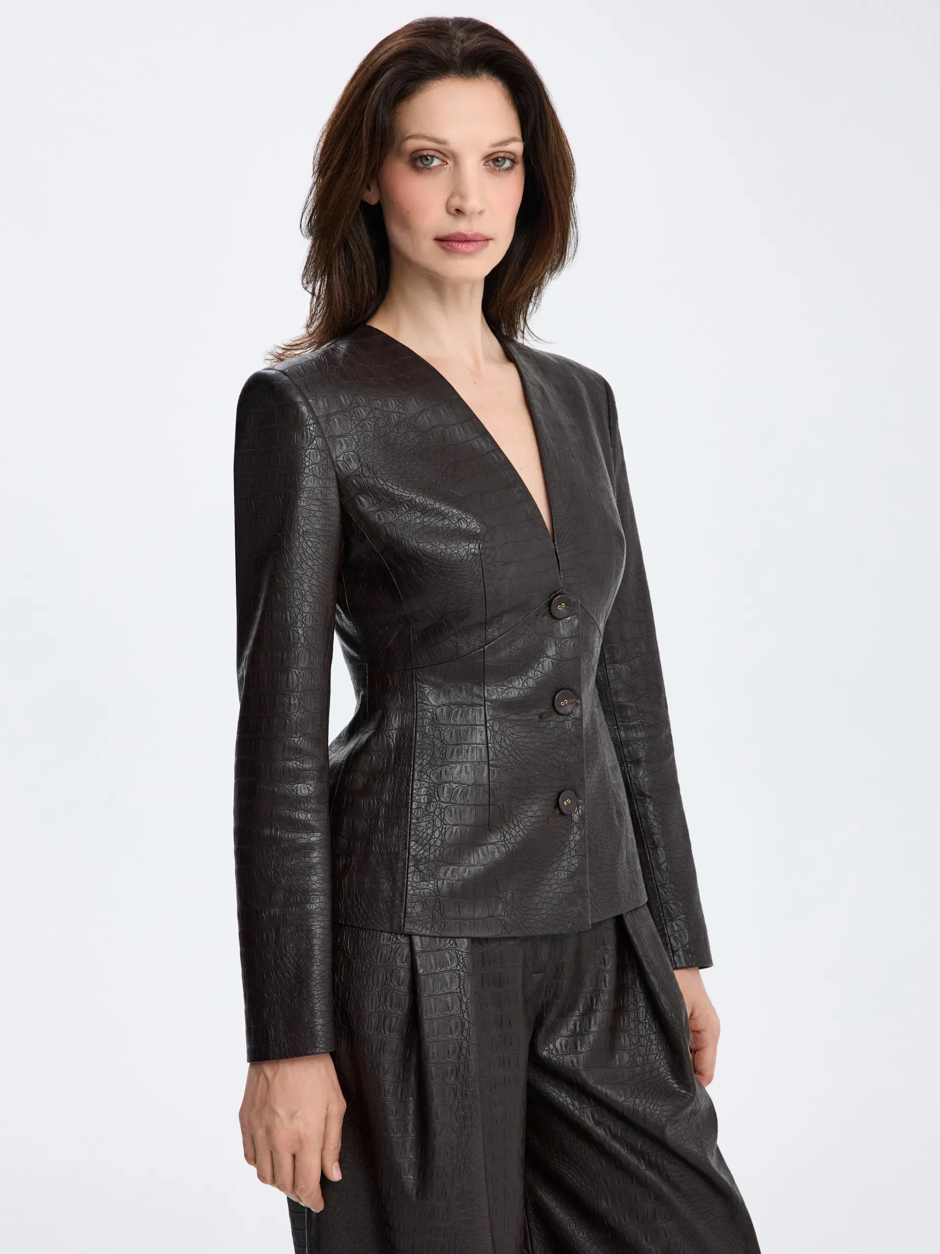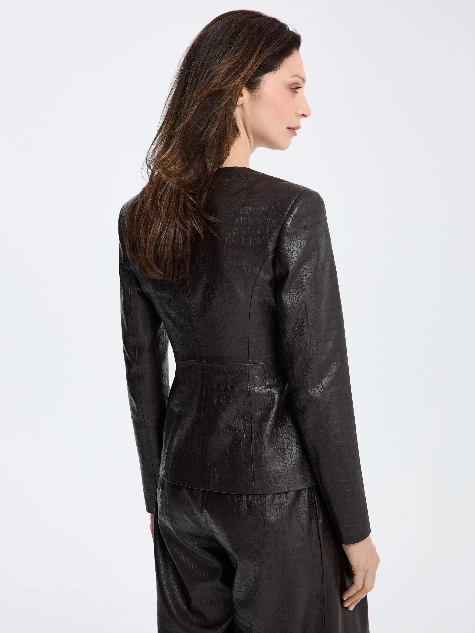 Жакет из фактурной экокожи без лацканов