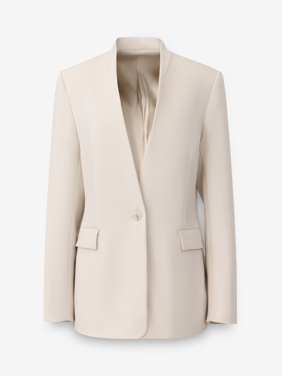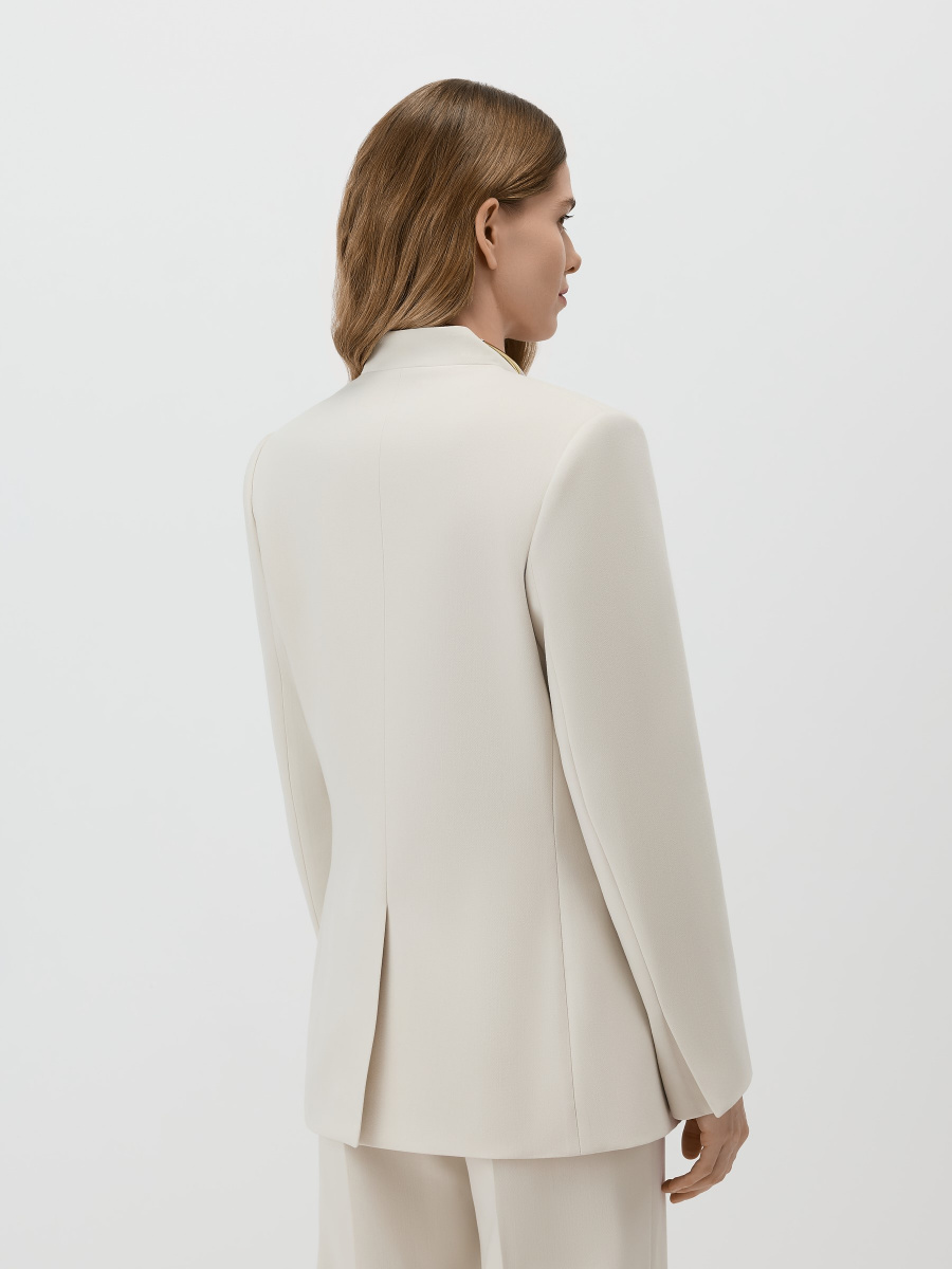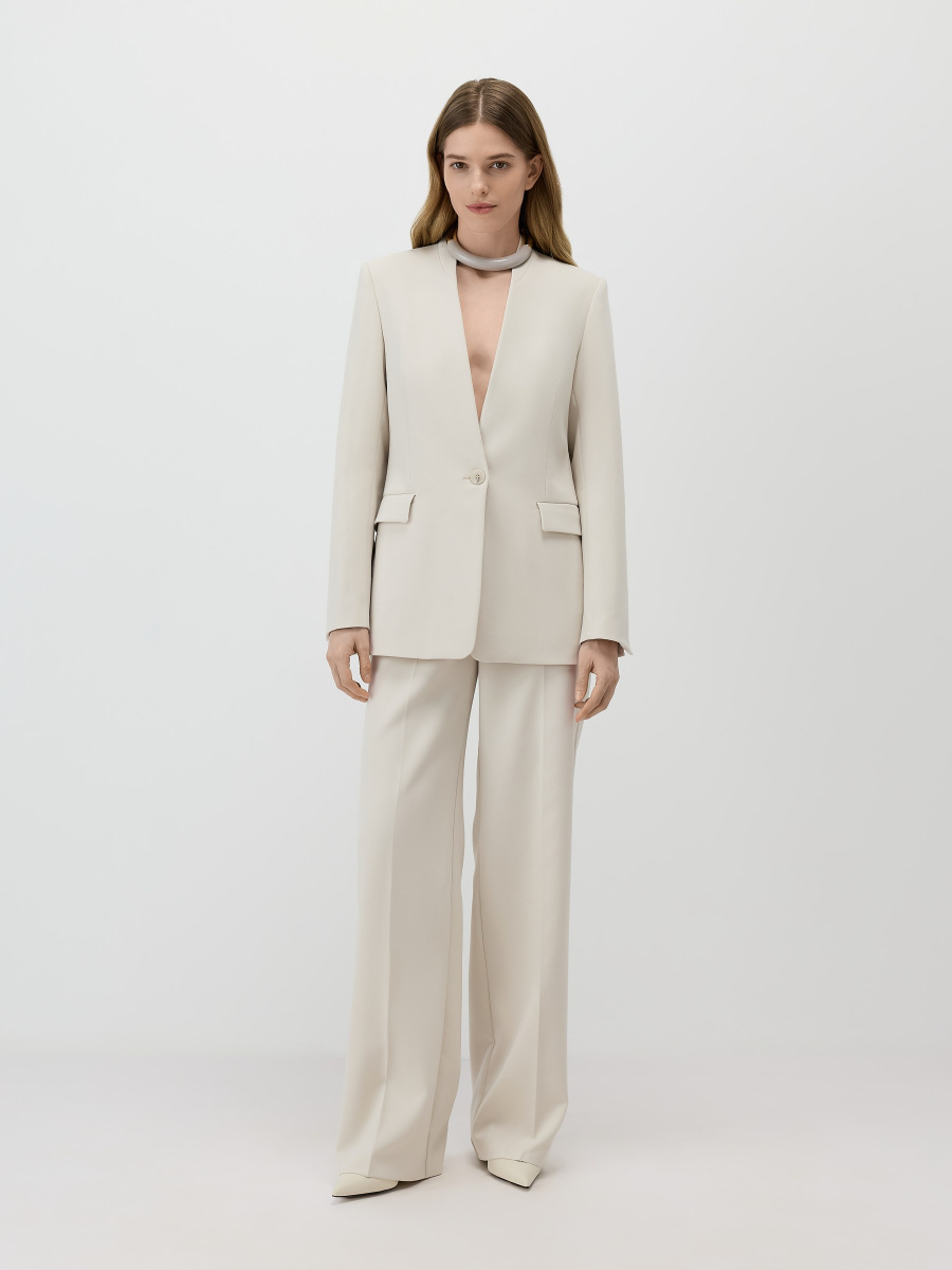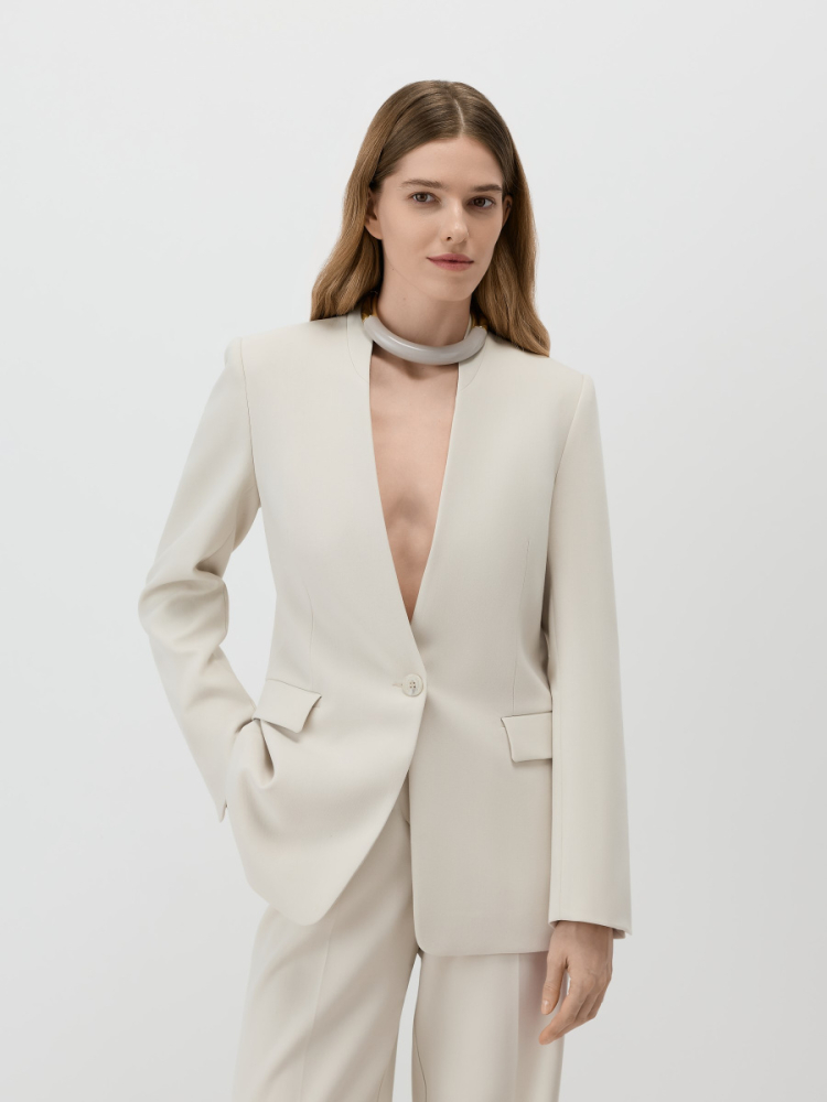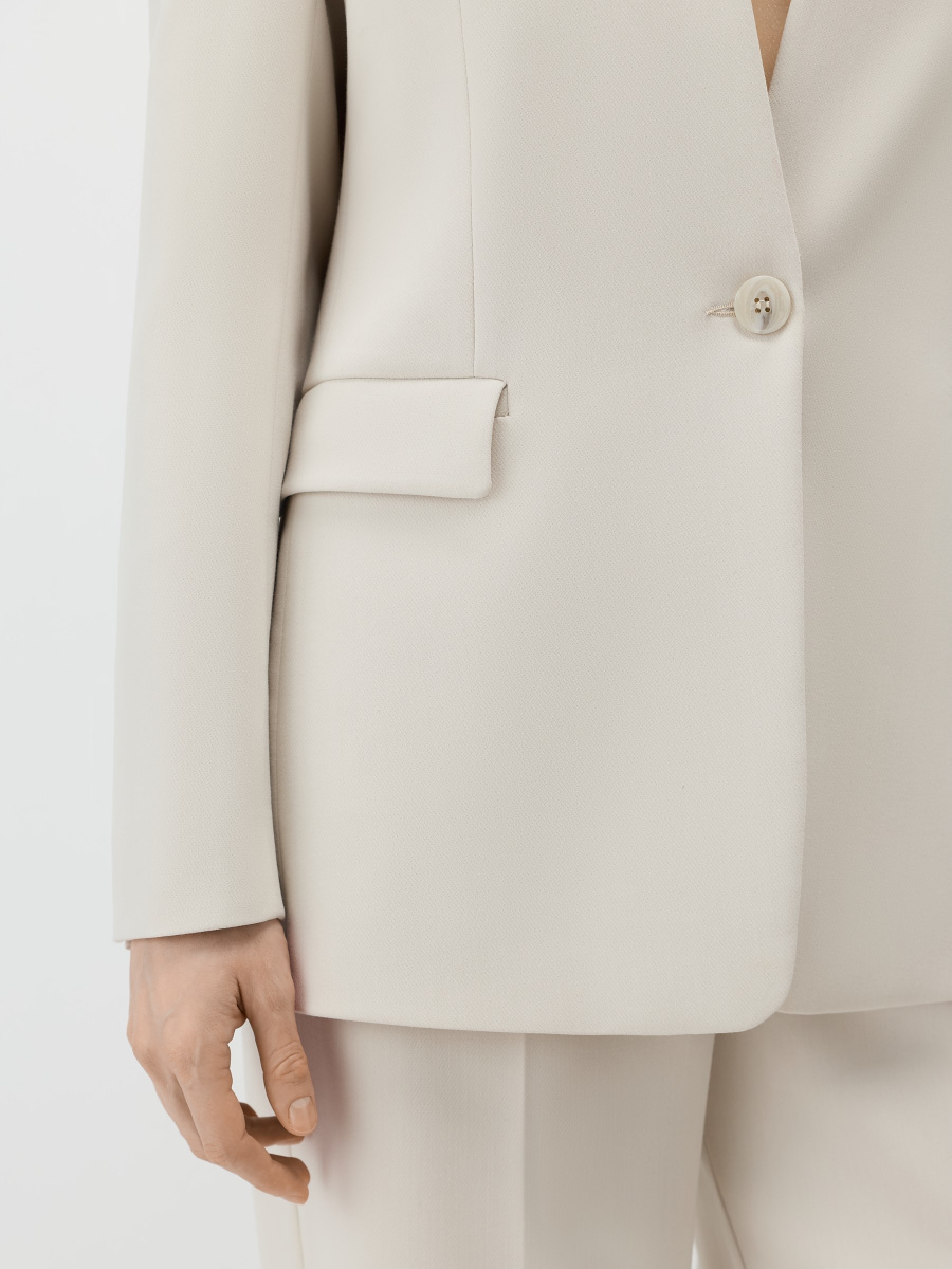 Однобортный полуприлегающий жакет из немнущейся костюмной поливискозы с матовым финишем. Модель без воротника и лацканов, четкого структурного кроя с мягкими подплечниками, центральным швом на спинке и двухшовными рукавами. Жакет дополнен прорезными карманами с клапанами, шлицей и шелковистой подкладкой в тон. Застежка на пуговицу под рог в тон изделия.