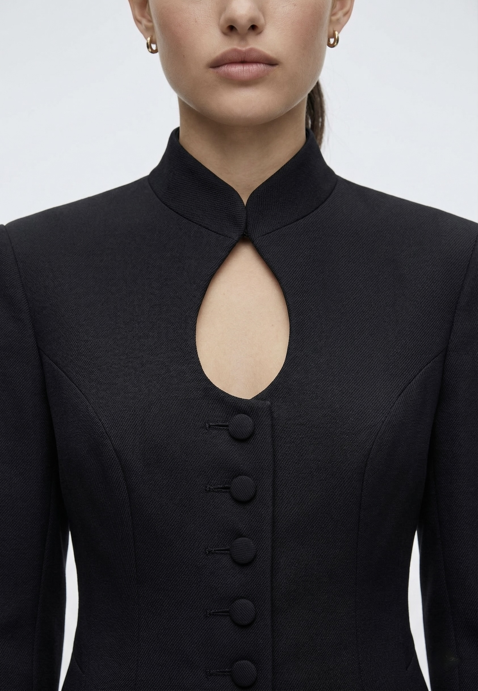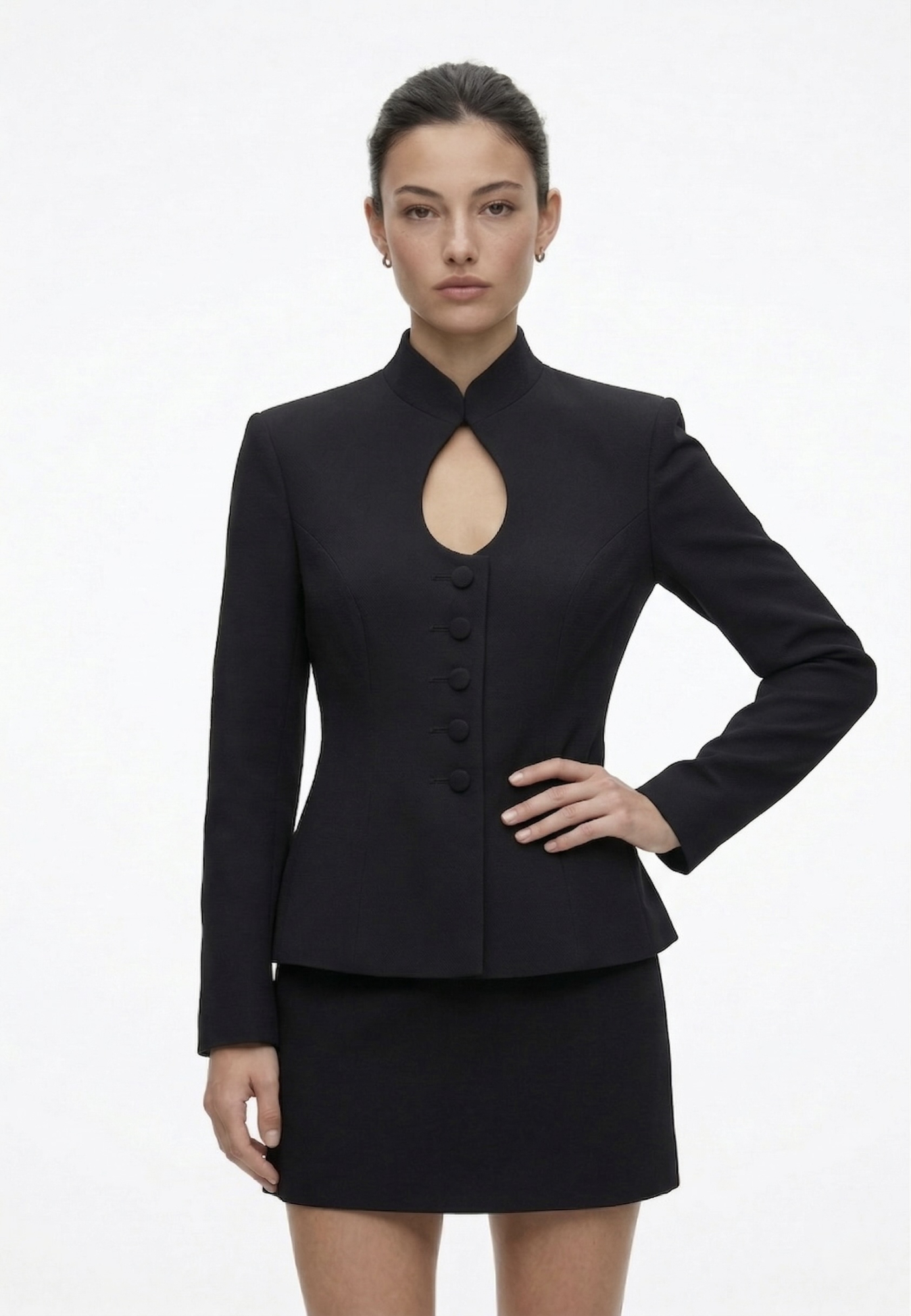 Черный приталенный жакет с фигурным вырезом – стильный акцент вашего образа! Визуально стройнит и подчеркивает достоинства фигуры. Подходит для работы, прогулок и встреч с друзьями – универсальность и элегантность в каждой детали.