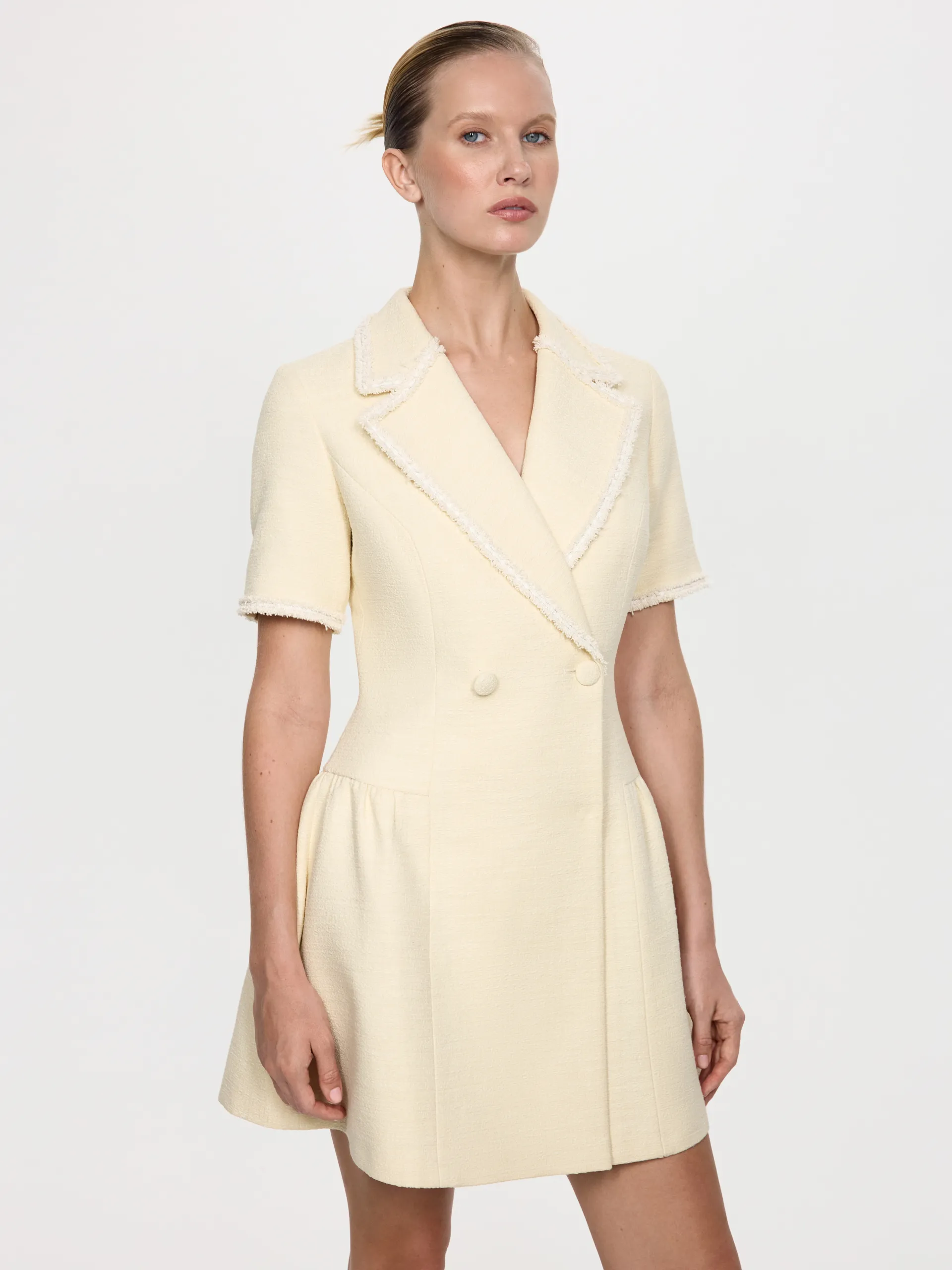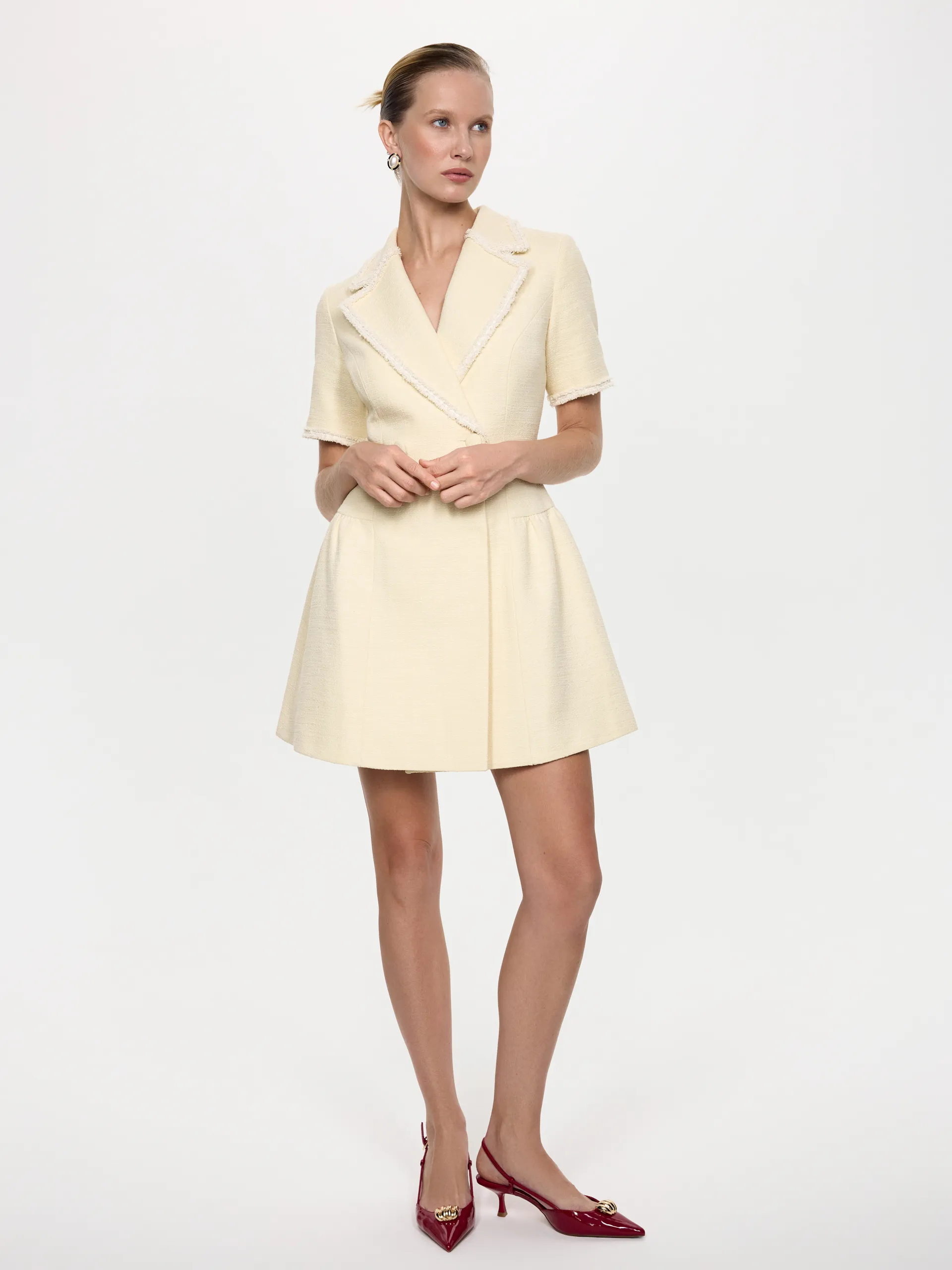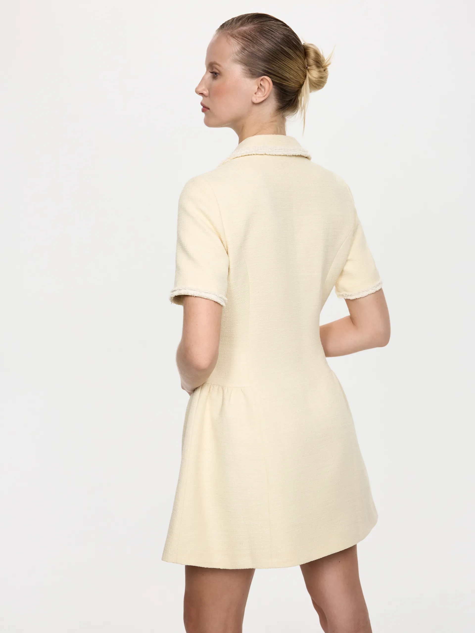 Платье выполнено из материала — твид, который отличается характерным переплетением, а в изделиях всегда выглядит дорого и элегантно. Деликатная отделка является своеобразным украшением этой модели, она подчеркивает воротник пиджачного типа и гармонично сочетается с контрастными пуговицами. Сливочный оттенок с золотым переплетением, создает нарядный и в тоже время лаконичный образ. Это самостоятельная опция, не требующая никаких дополнений, кроме стильных аксессуаров.