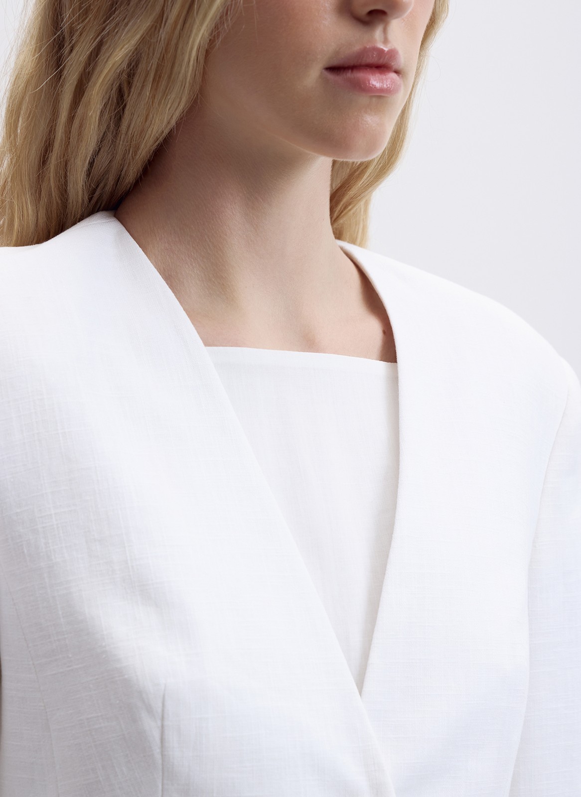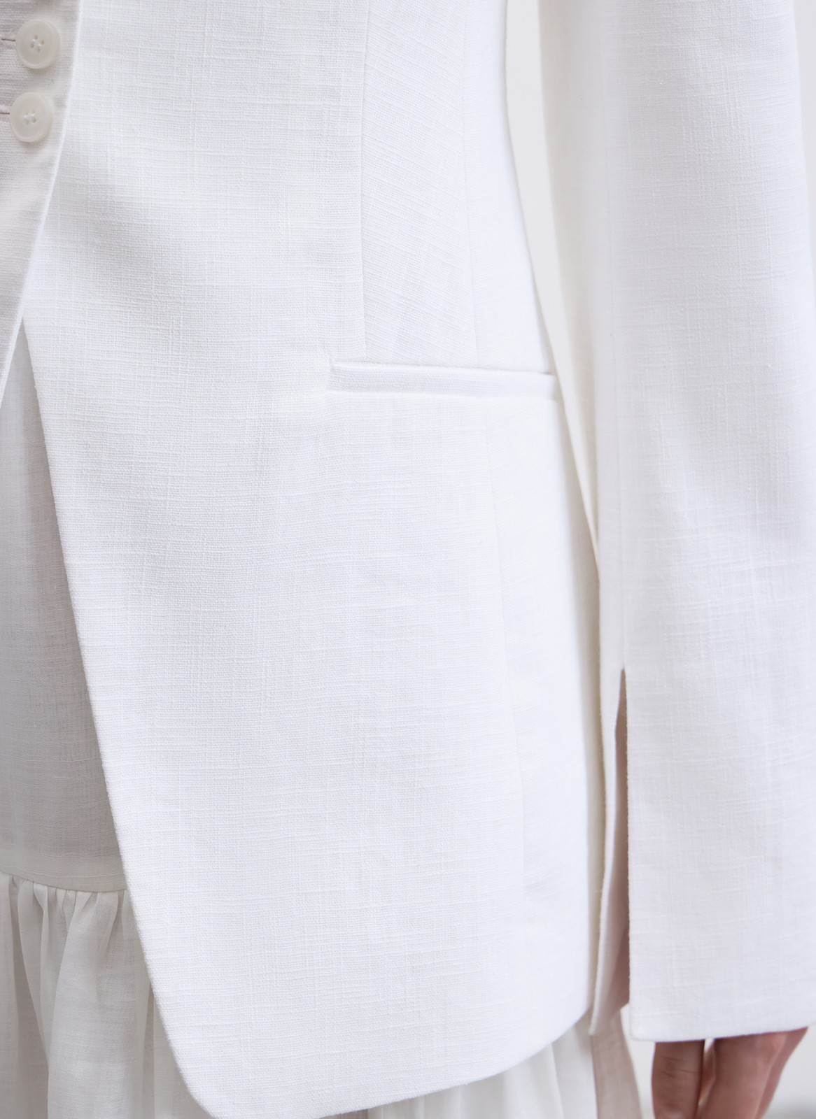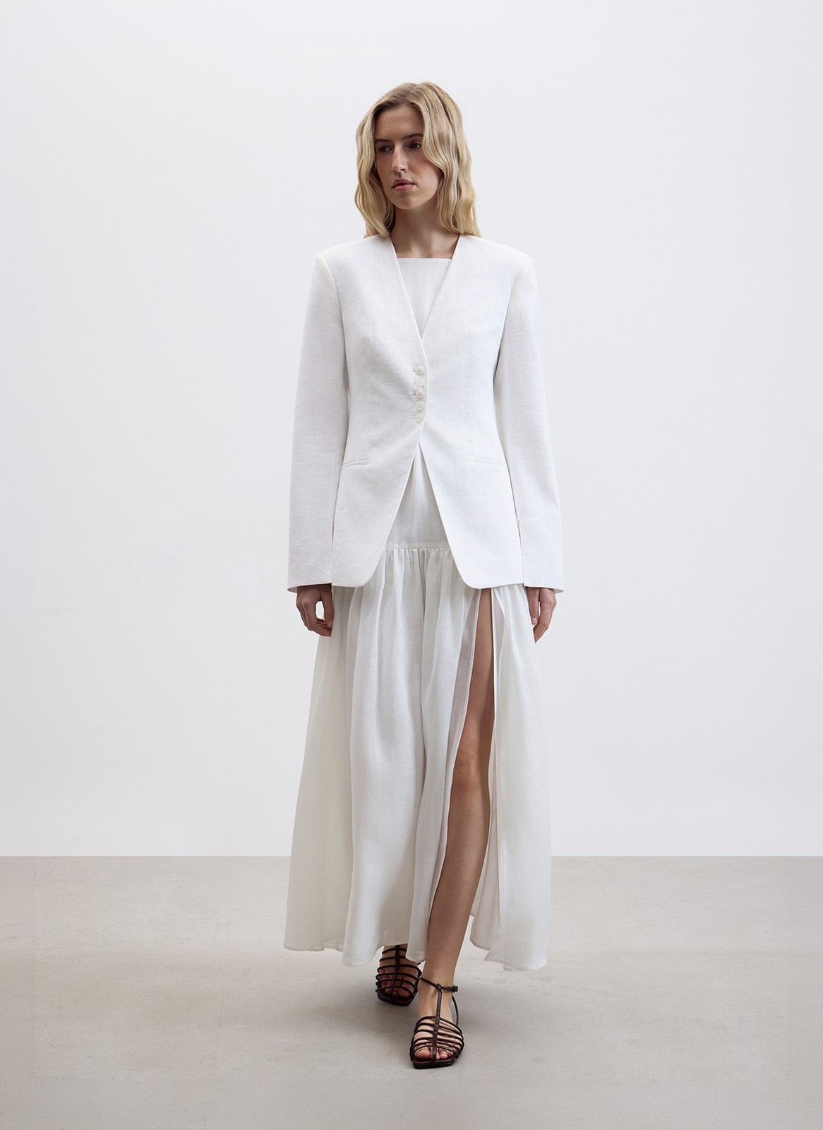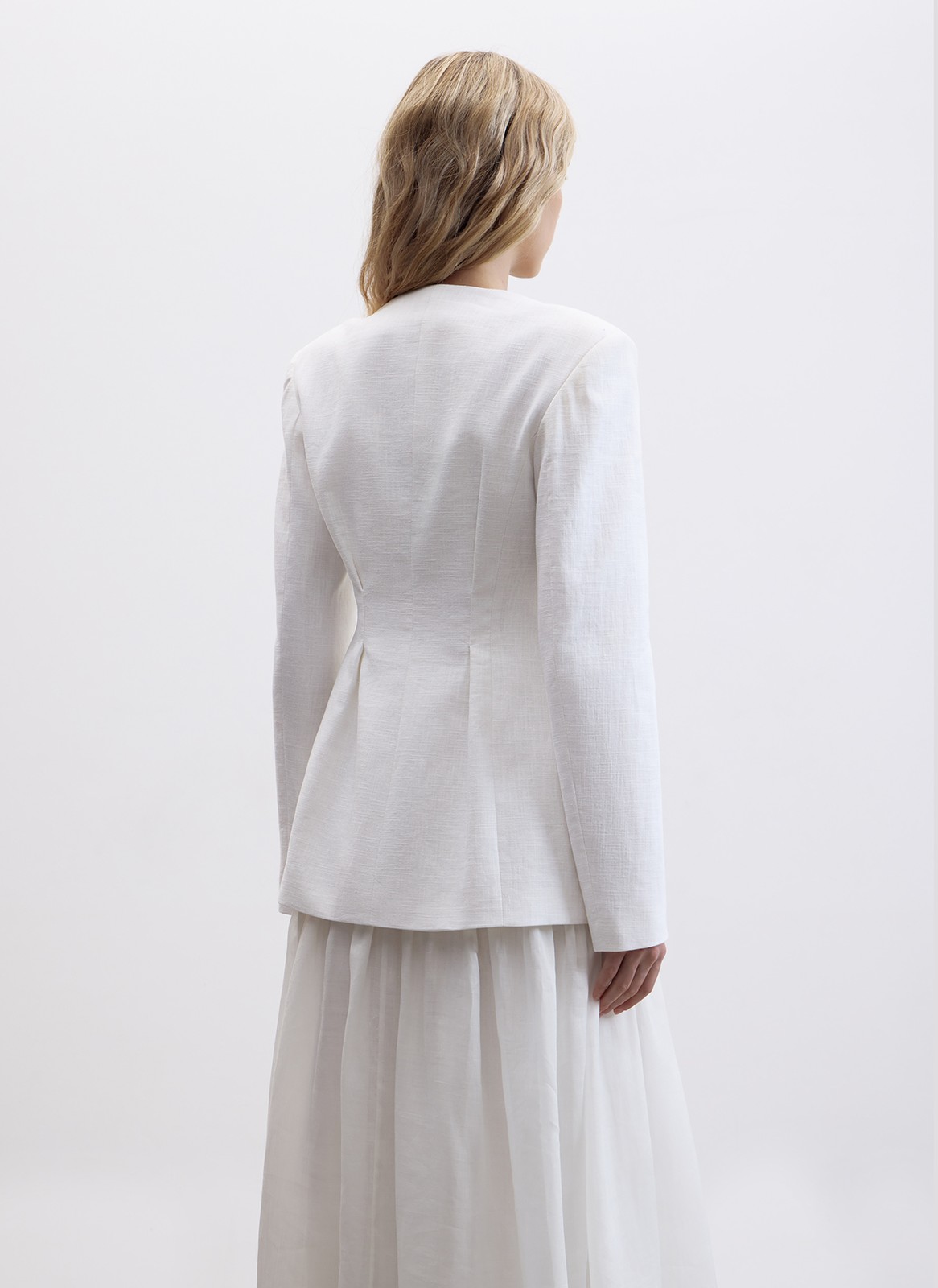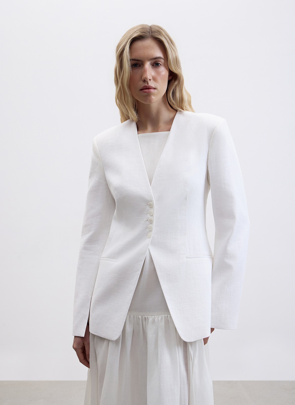 Минималистичный приталенный жакет с небольшим объёмом в районе бёдер создает эффектную игру форм.